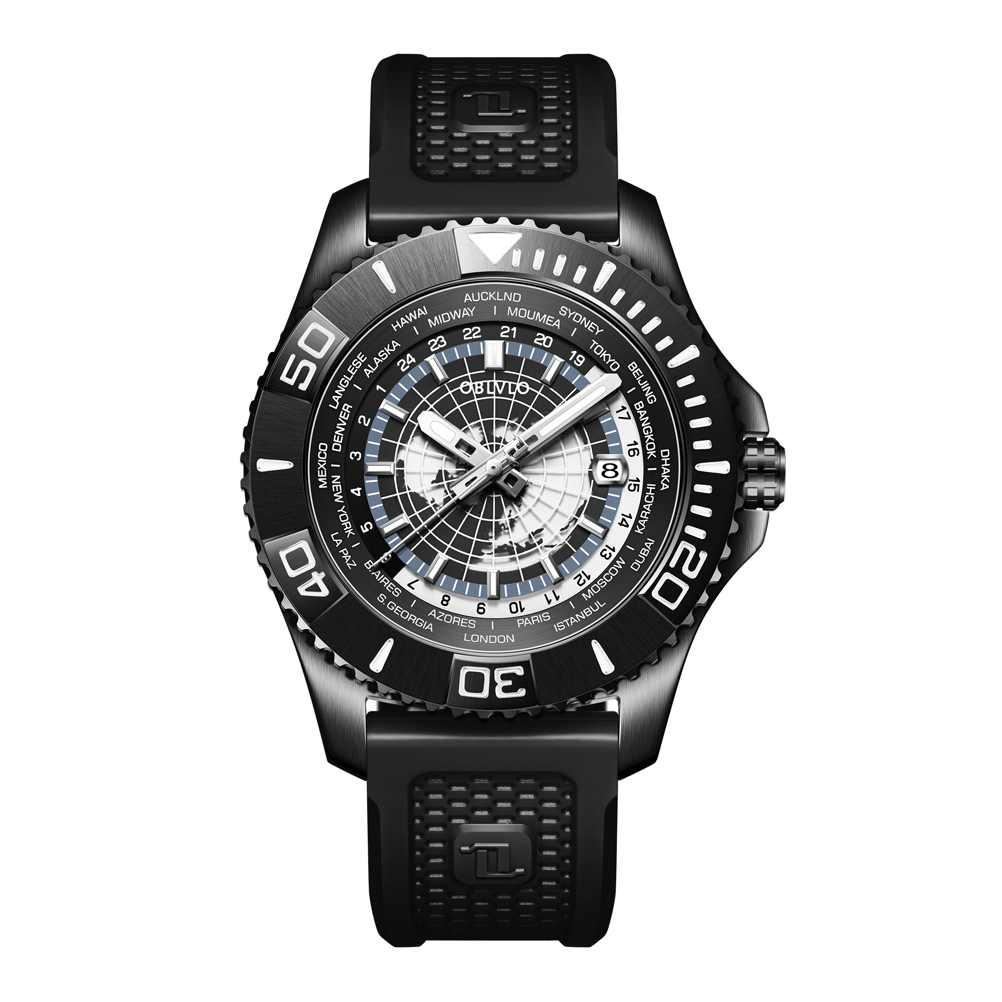 Dial Design: Panoramic world time with super luminous design, rotating bezel with markers, platinum-plated steel hands.