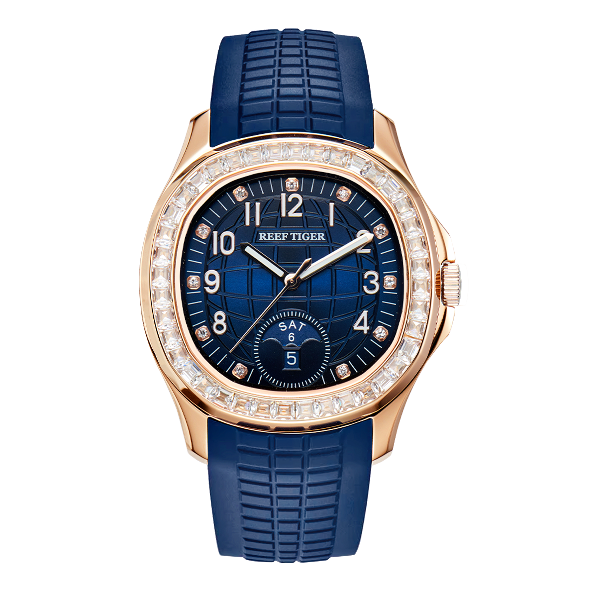 Dial Design: Blue Checkered dial, this watch showcases meticulously hand-set round-cut, square-set white zirconia stone indices, adding a touch of understated glamour. Luminous,Complete Calendar,Week Display.