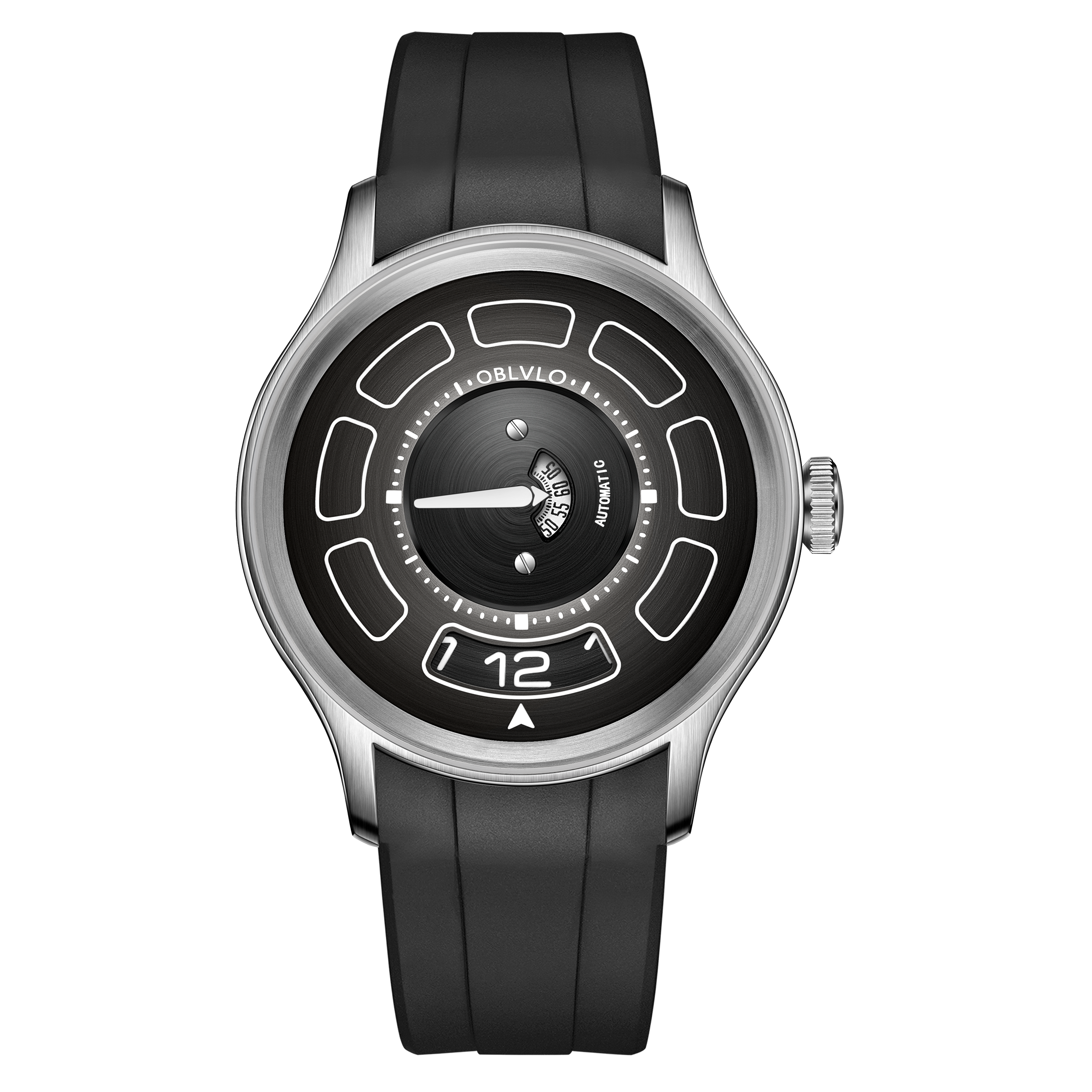 Dial Design: Black Mechanical Rotating Indices And Hands Dial, Unique UFO-inspired dial layout with innovative time display system and modern geometric elements. Sleek design with contrasting white markers creates a bold, contemporary look.