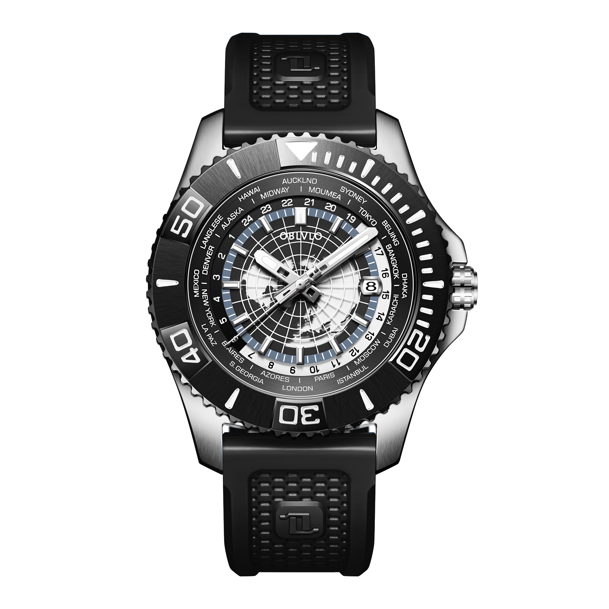 Dial Design: Panoramic world time with super luminous design, rotating bezel with markers, platinum-plated steel hands.