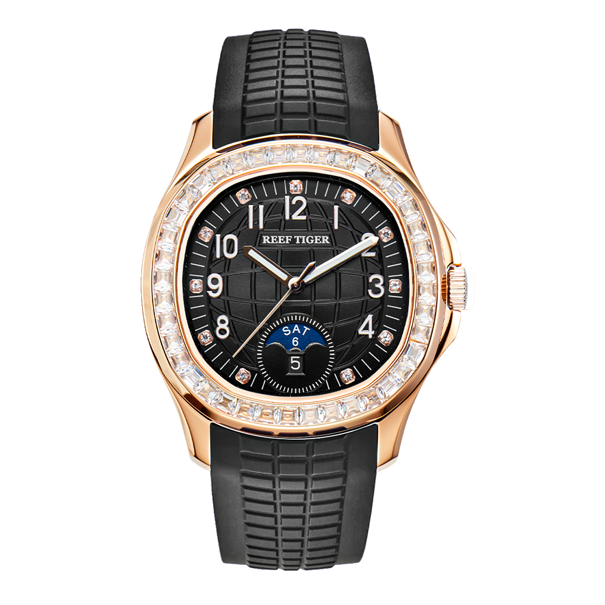 Dial Design: Black Checkered dial, this watch showcases meticulously hand-set round-cut, square-set white zirconia stone indices, adding a touch of understated glamour. Luminous,Complete Calendar,Week Display.
