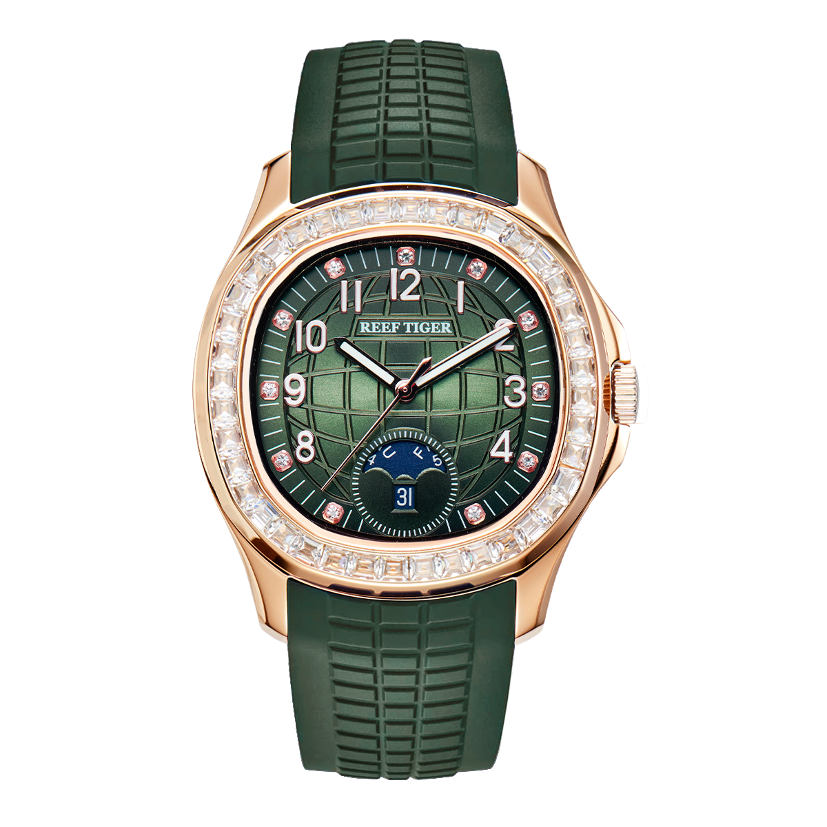 Dial Design: Green Checkered dial, this watch showcases meticulously hand-set round-cut, square-set white zirconia stone indices, adding a touch of understated glamour. Luminous,Complete Calendar,Week Display.