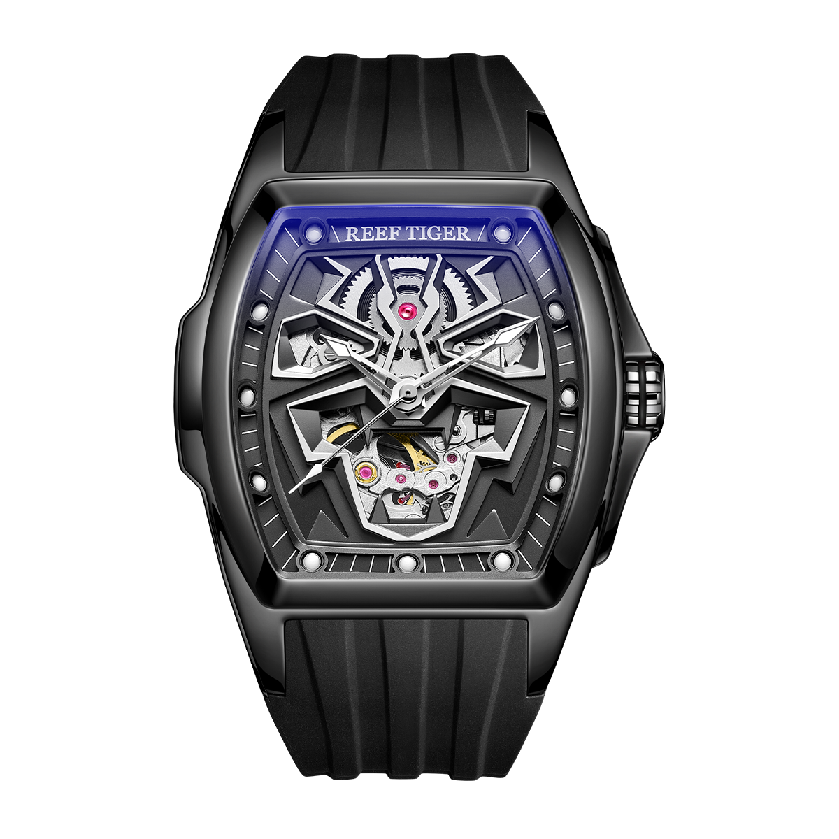 Dial Design: Black Skeleton Dial, Design Concept- Double-ARC geometric shape with panther shape disk, strong masculine charm. The dial is designed with the mask of a black panther, showing heroism and justice.