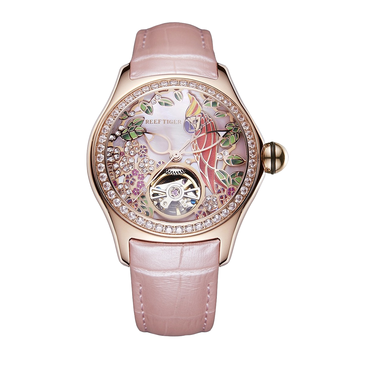 Dial Design: Pink Dial & Watch face is designed with Diamond citron crested cockatoo Dial & tourbillon style dial.