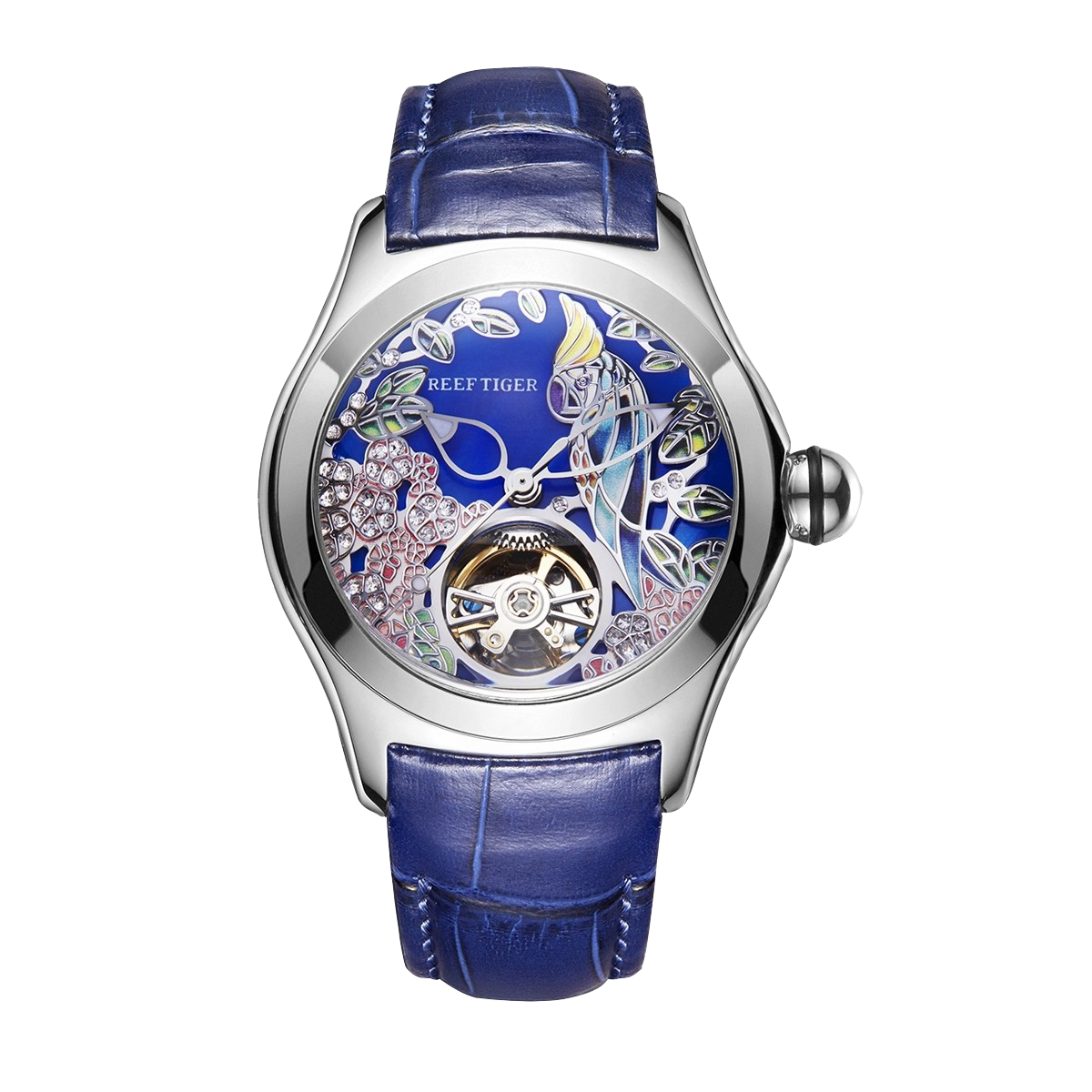 Dial Design: Blue Dial & Watch face is designed with Diamond citron crested cockatoo Dial & tourbillon style dial.